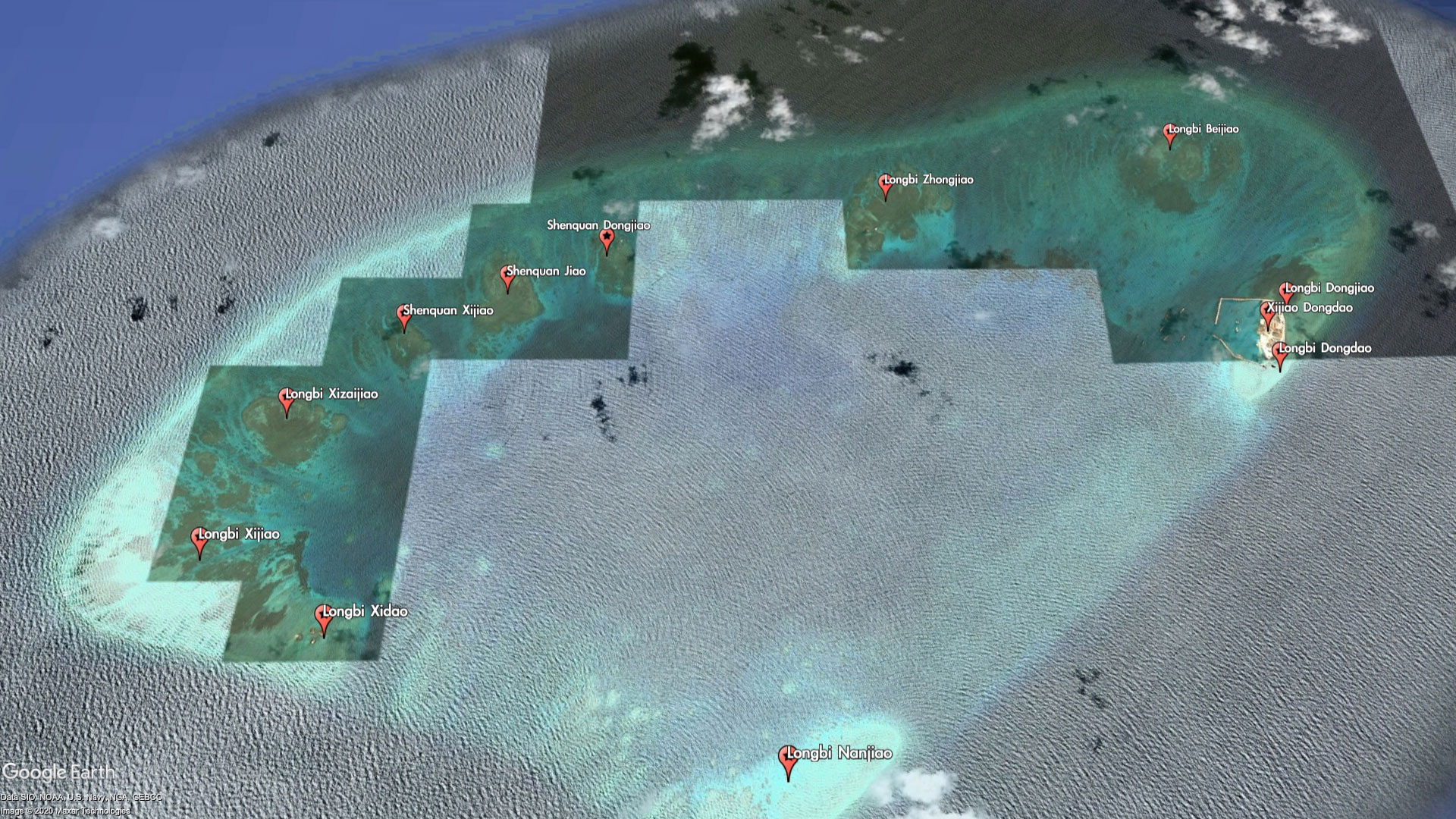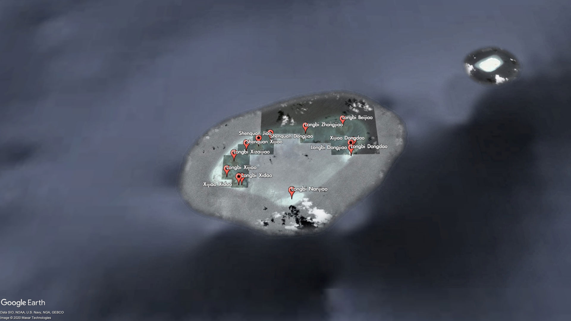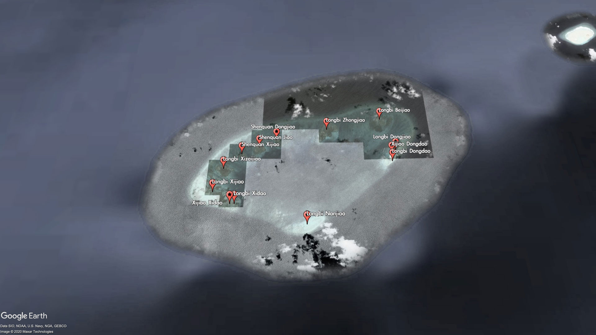 Other new features are clearly meant to plug the gaps between and around China's military outposts and artificial islands. Guangjin Beiyidao and Guangjin Bei'erdao (Guangjin North First Island and Guangjin North Second Island) are indistinguishable from each other, and China lists the same coordinates for both of them, but together with Guangjin Xidao (Guangjin West Island) they make up the small sand barrier on the western side of Duncan Island, which houses a Chinese-built harbor and outpost.