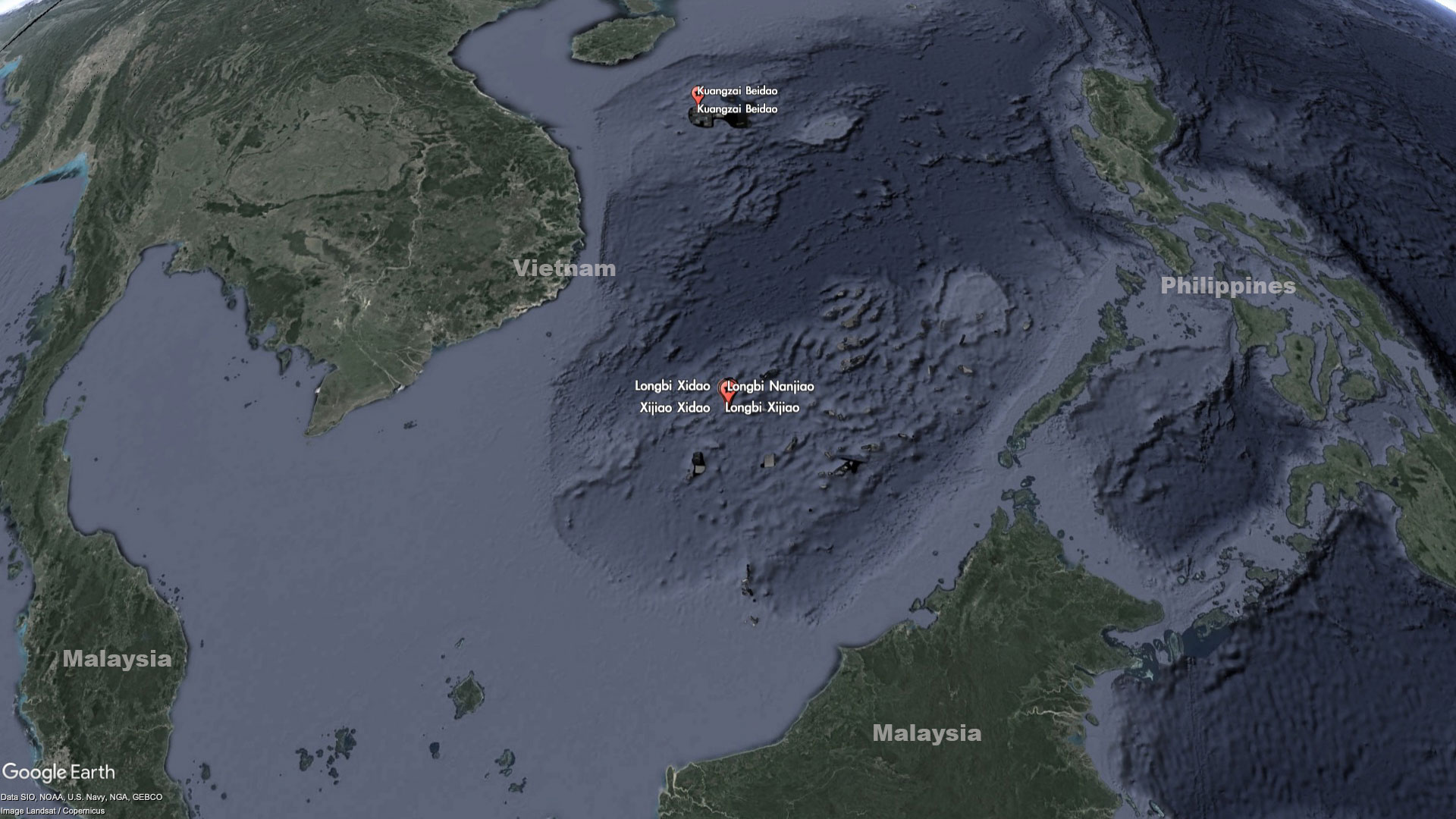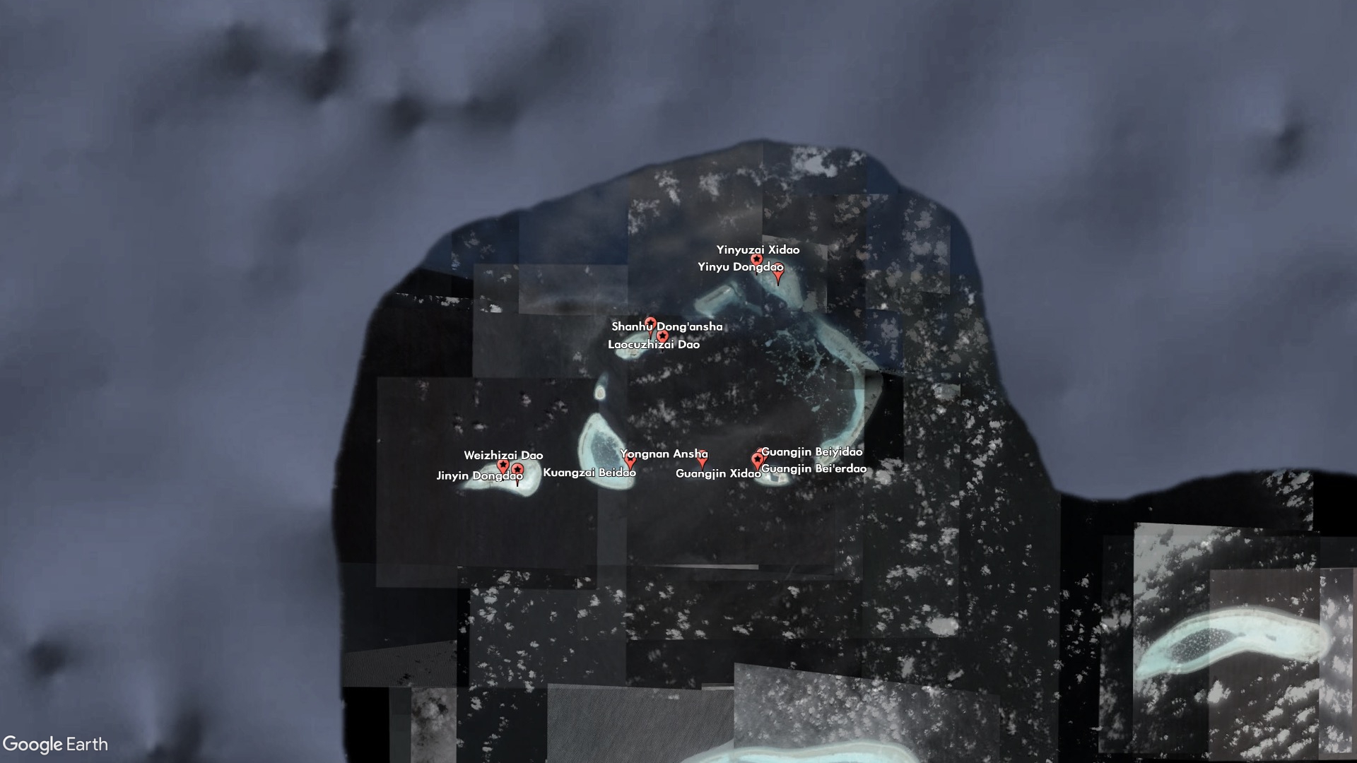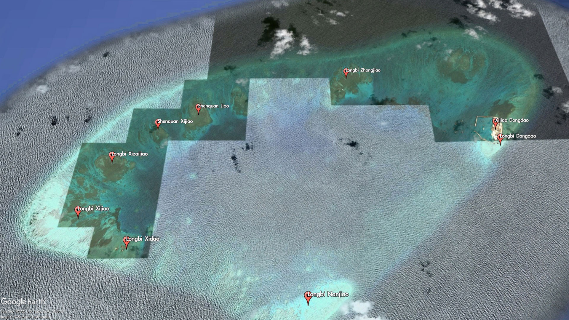 Other new features are clearly meant to plug the gaps between and around China's military outposts and artificial islands. Guangjin Beiyidao and Guangjin Bei'erdao (Guangjin North First Island and Guangjin North Second Island) are indistinguishable from each other, and China lists the same coordinates for both of them, but together with Guangjin Xidao (Guangjin West Island) they make up the small sand barrier on the western side of Duncan Island, which houses a Chinese-built harbor and outpost.