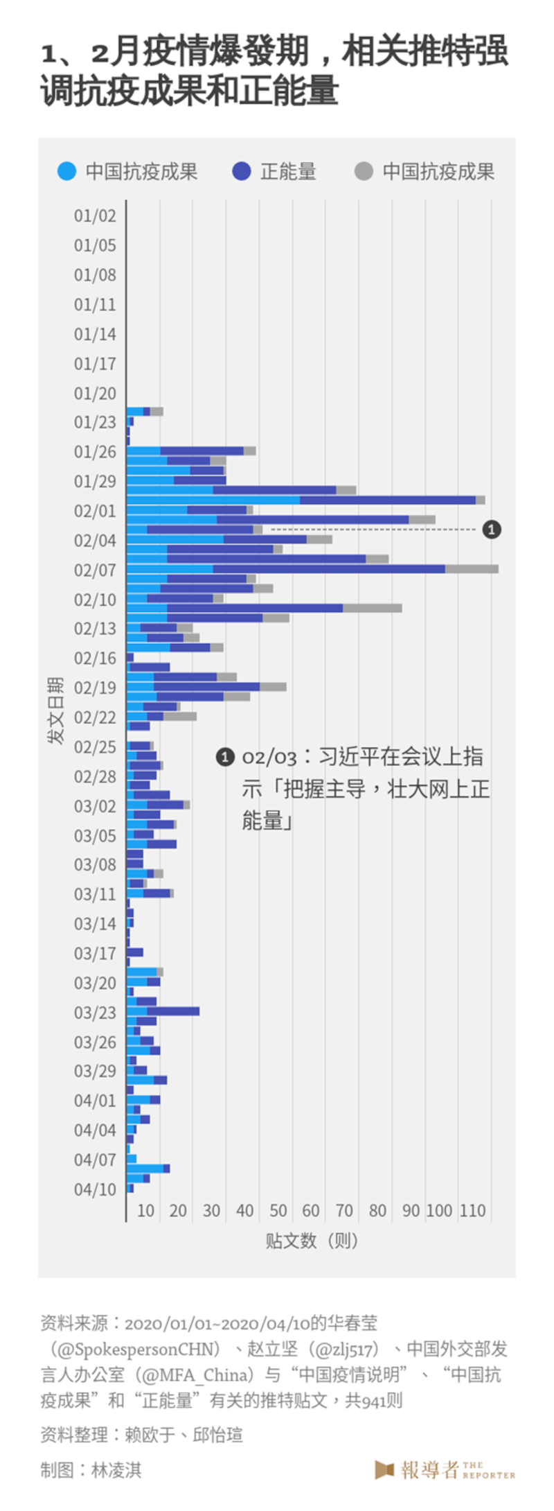 1月30日,世界卫生组织(World Health Organization, WHO)宣布COVID-19构成“国际突发公共卫生事件”。当天早上,中國国家卫生健康委员会发布前一日病例数,西藏出现首例确诊,疫情蔓延中国所有省分;2月8日死亡人数超过800人,超过2003年SARS的全球死亡人数;2月12日,湖北省新增14,840例确诊病例,创单日新高。在疫情大爆发与全球注视下,如何讲好中国抗疫故事,成为这一时期的关键任务。