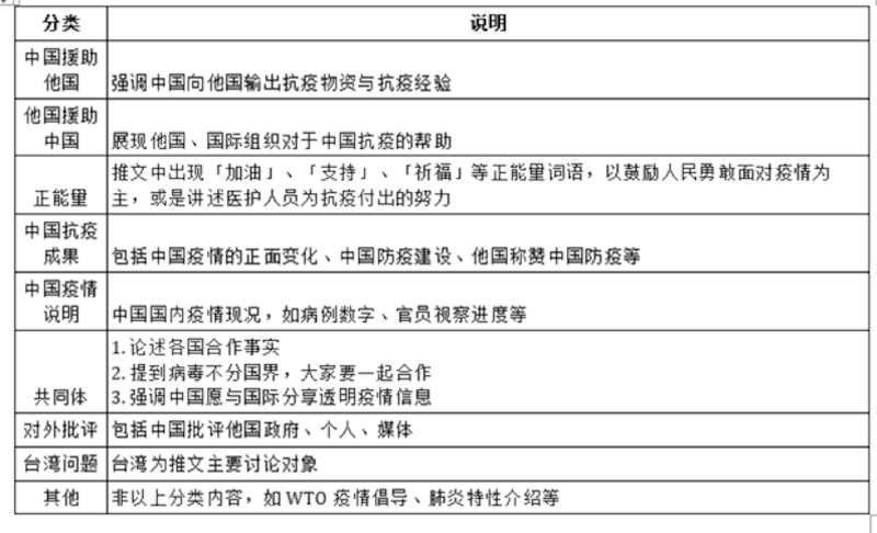 本篇报导爬梳中国外交部发言人华春莹(@SpokespersonCHN)、中国外交部发言人赵立坚(@zlj517)、中国外交部发言人办公室(@MFA_China)三者2020年1月1日至4月10日在推特的发文数据,针对该时间段共4,574则推文进行分类。以人工标记的方式,先将推文区分为"与COVID-19有关"和"与COVID-19无关"两类,再依议题属性进行9项分类。若一则贴文中有两种属性以上,则会标记多种分类,各项分类依据如下: