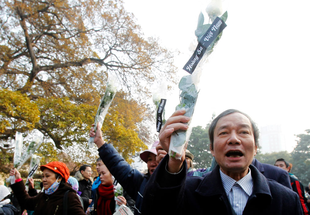 Blogger chính trị Nguyễn Tường Thụy (R) cầm hoa có dòng chữ